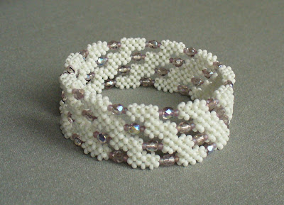 Sajnos nem jól sikerült a kép, de egy finom kis ékszert sikerült csinálnom. Igazi nőies színekben. Enyhe fényű hófehér és halvány csillogó-villogó ametiszt színekben: